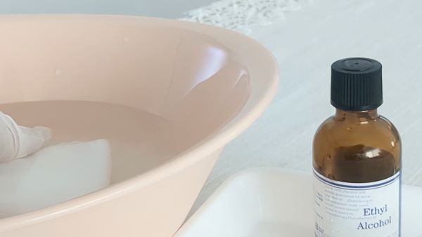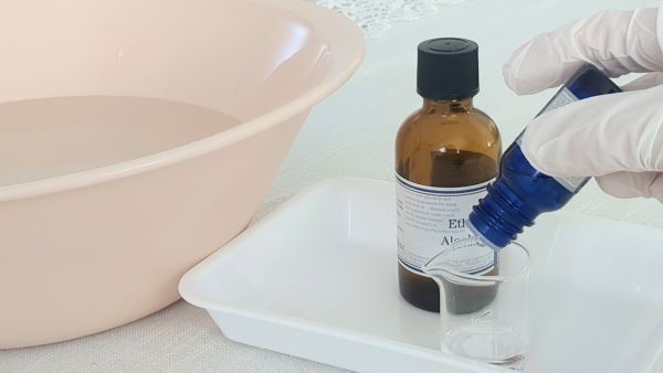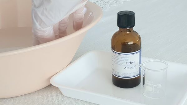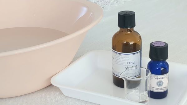 そして重要なこととして、ラベンダーに限らず他の香りもそうですが、アロマは湯(水)に溶けません。薬局やアロマショップで無水エタノールを購入し、それにラベンダーを溶かしてから使います。