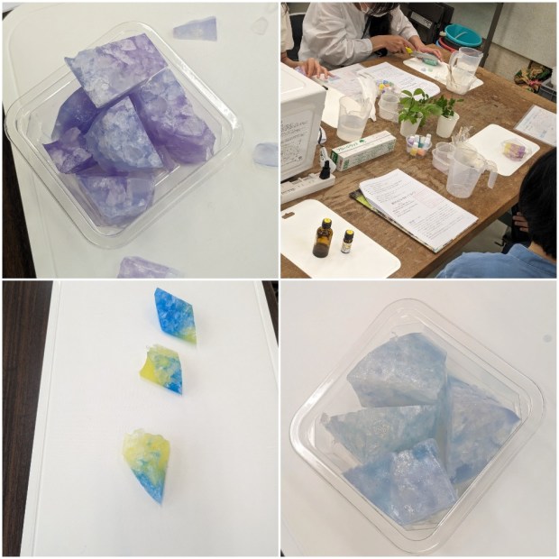 このキラキラ宝石石けんは、途中アロマを加えやすいので、アロマテラピー講座との組み合わせも相性が良いです。