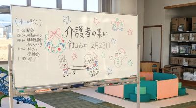 こんにちは。大玉村社会福祉協議会様の「介護者のつどい」で水ようかん風石けんづくりを開催させて頂きました。会場に入ると、ホワイトボードに素敵なイラストが!!職員様が描かれたとのことで、とっても可愛らしくて、ほのぼのした気持ちになりました。(許可をいただいて、撮影させていただきました。)