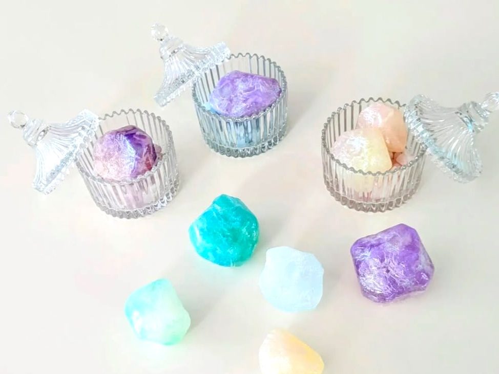宝石の原石風につくるデザイン石けん。天然アロマ使用。カット方法にもよりますが、4個程度完成します。ガラス容器(1名様1個)つき。