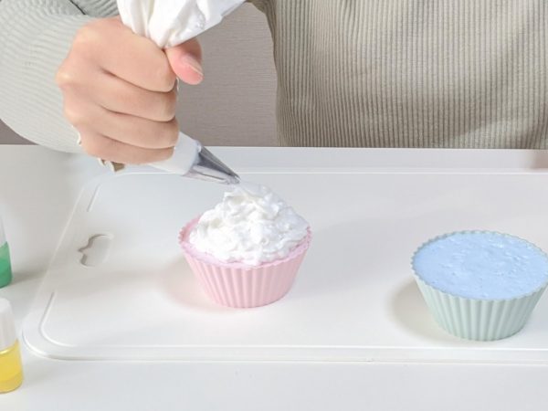 今回作ったのは、まるで本物のスイーツのような**「カップケーキ石けん」**です。ホイップクリームのように絞った石けんをデコレーションして、世界に一つだけのオリジナル作品を仕上げました。