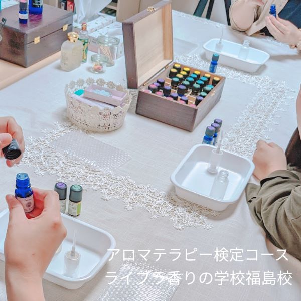 当教室の部屋を使って、AEAJ認定スクール「ライブラ香りの学校福島校」の講座を開講しています。アロマテラピー検定対策からセラピスト養成まで、アットホームな雰囲気の中でゆったりと学んでいただけます。20代から70代まで、幅広い年代の方がアロマの奥深い世界を楽しんでいらっしゃいます。